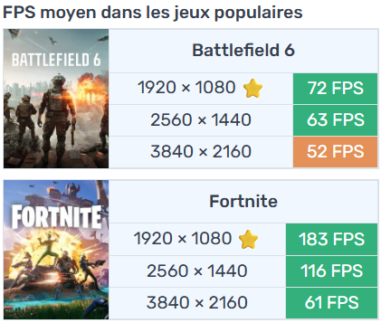 En 1440p, les titres comme Fortnite, Apex Legends, CS2, Rocket League tournent facilement à 90–120+ FPS, tandis que les jeux plus exigeants (Cyberpunk 2077, Starfield, Baldur’s Gate 3) sont jouables en 1440p Moyen à Élevé à 40–60 FPS, souvent plus avec DLSS activé.
